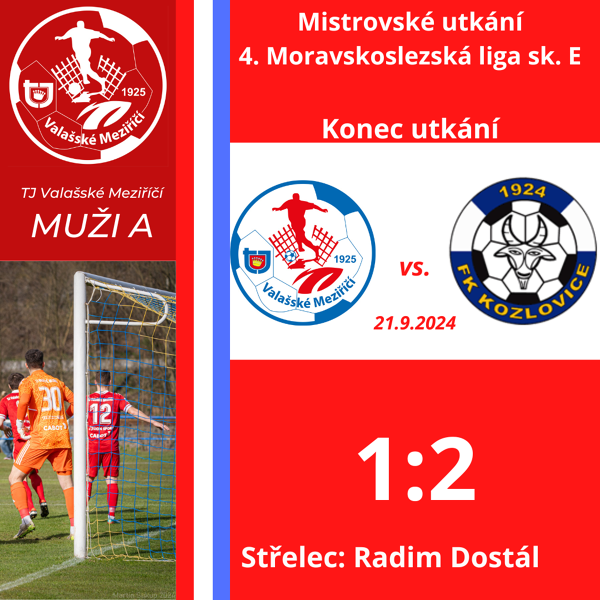 TJ Valašské Meziříčí - FK Kozlovice 1:2 (0:1), sobota 21.9.2024, 15.30 hod.